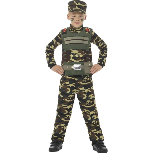 This is a Smiffys Camouflage Military child's costume that includes the top, trousers and hat.