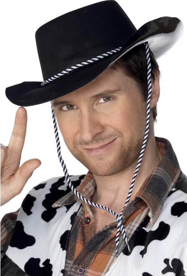 This Mens Fancy Dress Accessory Is A Black Flocked Western Style Cowboy Hat With Cord