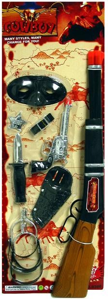This fancy dress accessory is a Cowboy Set and includes Rifle, Handgun with holster, Eyemask, Spurs, Knife and Sheriff Badge