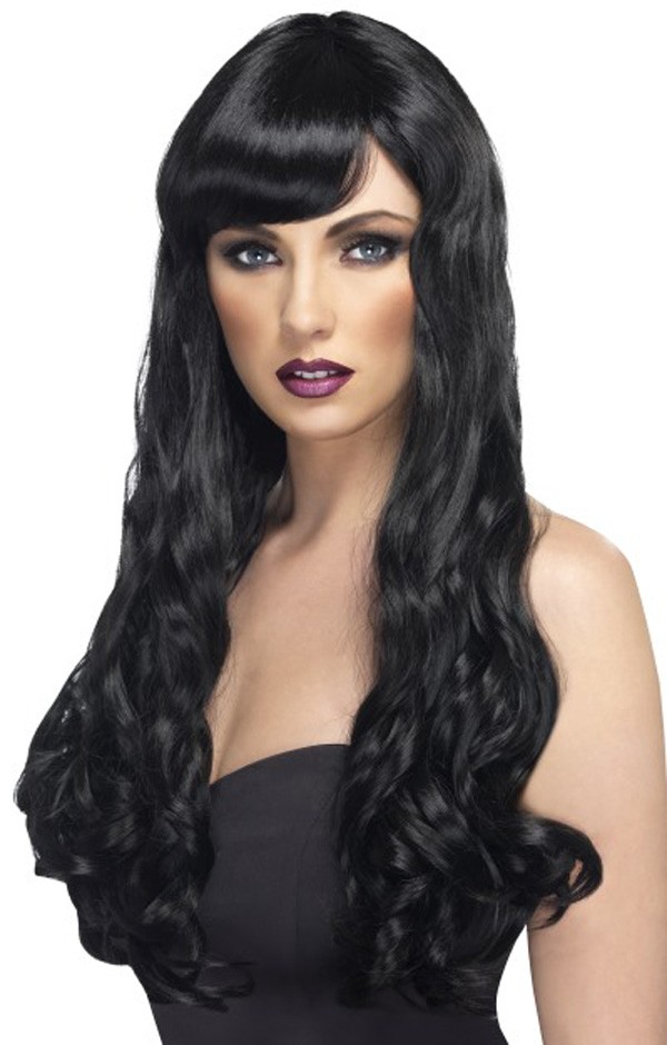This Ladies Fancy Dress Accessory Is A Very Long Curly Black Wig With A Swept Aside Fringe
