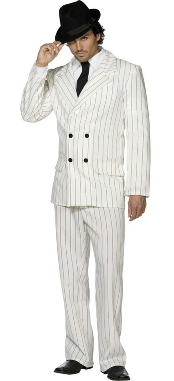 This Men's Fancy Dress Is A Fever Gangster Costume Which Includes White Pin Striped Jacket, Trousers And Tie.
