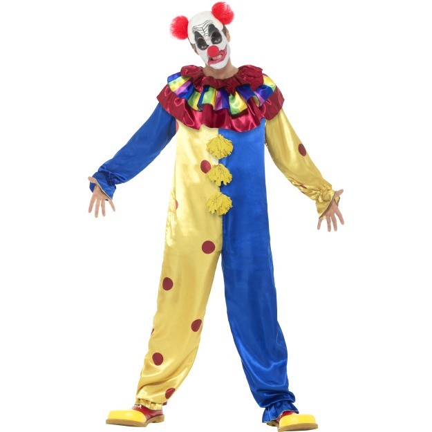 This is a Smiffys men's Goosebumps Clown costume that includes the jumpsuit, latex wig cap, make-up, red nose and fake teeth.
