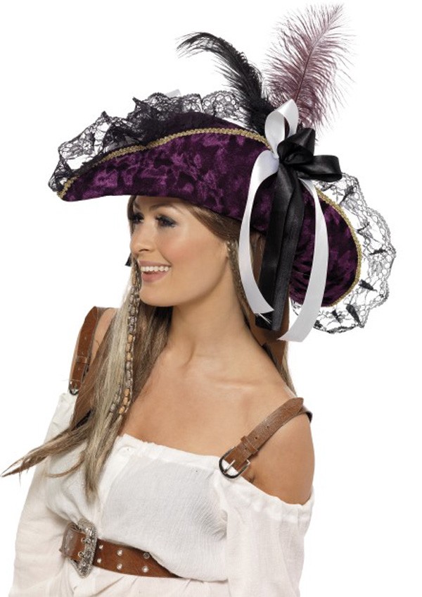 Complete Your Pirate Look With This Stunning Fever Marauding Pirate Fancy Dress Hat In Purple With Feathers And Ribbon Detail
