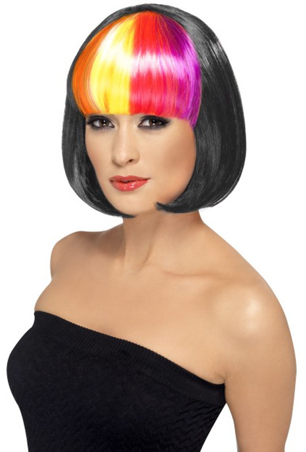This Ladies Fancy Dress Accessory Is An Black Partyrama Wig. Short Jaw Length Wig With Multicoloured Fringe