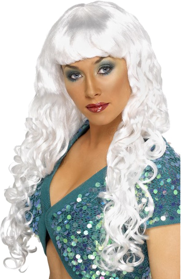 This Ladies Fancy Dress Accessory Is A White Siren Wig. Long Curly Wig With Fringe.