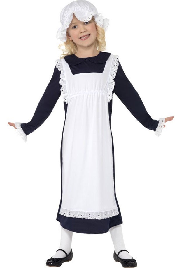 This Girls Fancy Dress Is A Victorian Poor Girl Maid Costume Which Includes Dress, Apron And Hat. Great School Bookweek Costume.