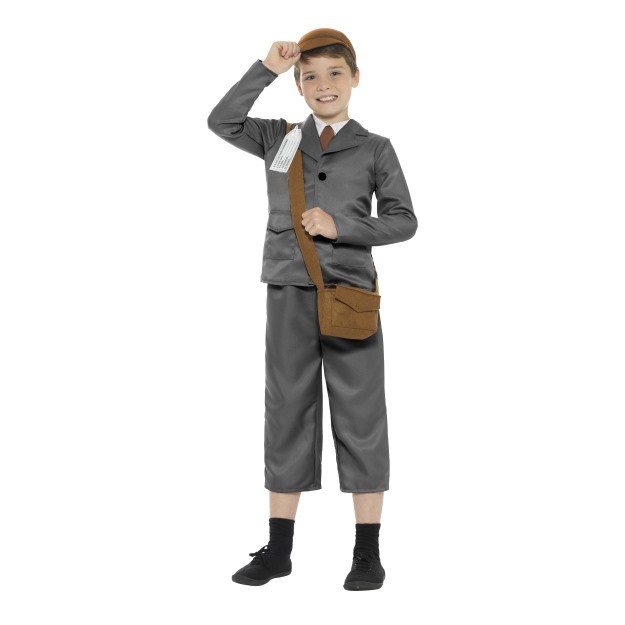 This is a Smiffys Evacuee boy costume that includes the jacket, trousers, mock shirt, bag, hat and name tag.
